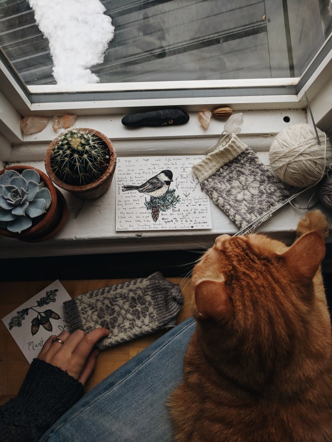 With our recent snows ❄️ and cold I too have been desiring to hunker down write, knit and weave. This afternoon it was with a cup of pumpkin spice herb tea and knitting on a pair of fingerless mitts for an elderly lady in my yoga class who’s hands get severely cold in class.