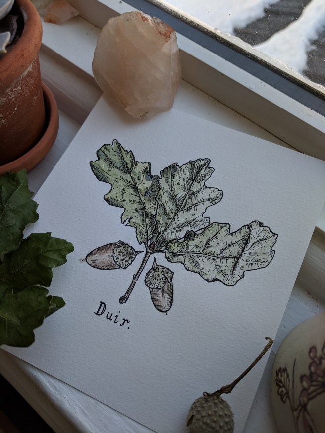 Today, I really just wanted to take the time to begin to document a creative project – a small zine about my love for the natural world.  I really want to begin the process of illustrating and writing a children’s book and thought that a simple, self published zine might be a good way to start.  And so,  I would love for you to see the beginning of my zine Duir the Gaelic world for Oak and cognate with our word for door.  A gateway  between worlds.  The Oak, king (or Queen) of the forests with the deepest roots.  Sharing both the above material world and the depths of the soil beneath our feet (conscious vs subconscious perhaps! or Fairy vs Human).
