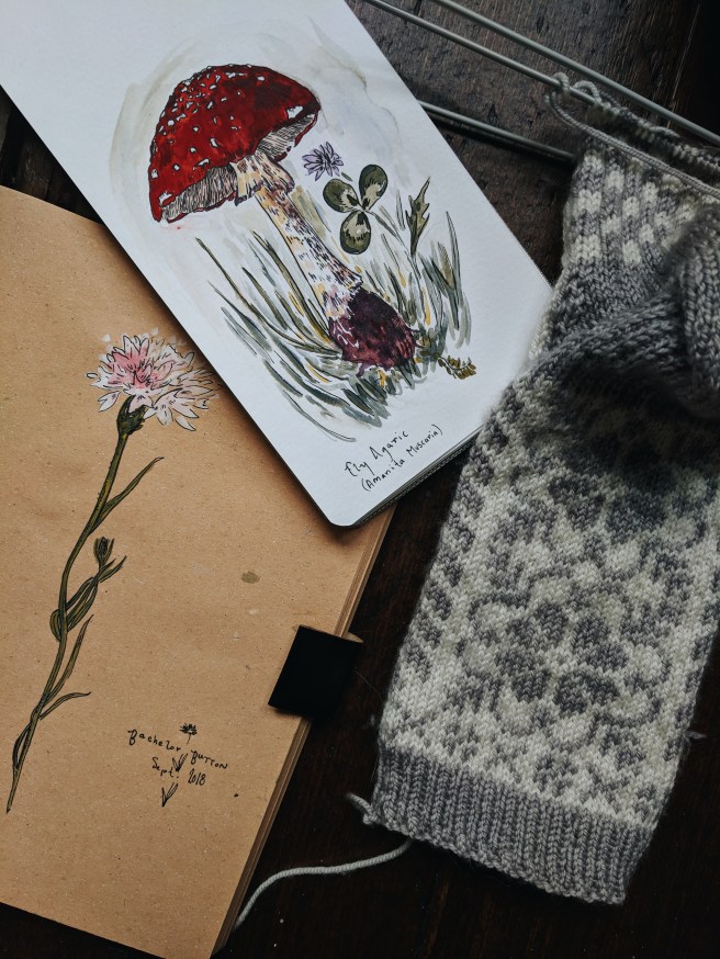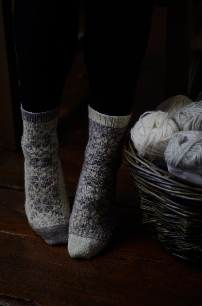 So , lets summon up August – the month of heat, berries, harvests and summer hanging by a strong thread. Cooler breezes in the evening and the first significant change in the lowering sun in the sky. I have wanted to make some intricate socks using Malabrigo Sock yarn for a while now. It’s a lush sock yarn, albeit quite expensive. After what felt like eternally rolling those skeins of wool into balls – I hunted through my extremely awesome book Traditional Fair isle Knitting by Sheila McGregor for a floral motif that I could use as the main panel. The one I chose, just jumped out at me from the page and I think asked to be used! I have never tried stranded colourwork using such fine needles (just 2mm) and was a little nervous that I lacked the skill – The end result definitely didn’t turn out perfect – even after a solid blocking. Regardless these will just be worn by my feet carrying my intention and I’m very happy with them as a small wearable piece of magic (until, I’m cursing at the 100 year old floor nails that will ultimately lead to their messy demise).