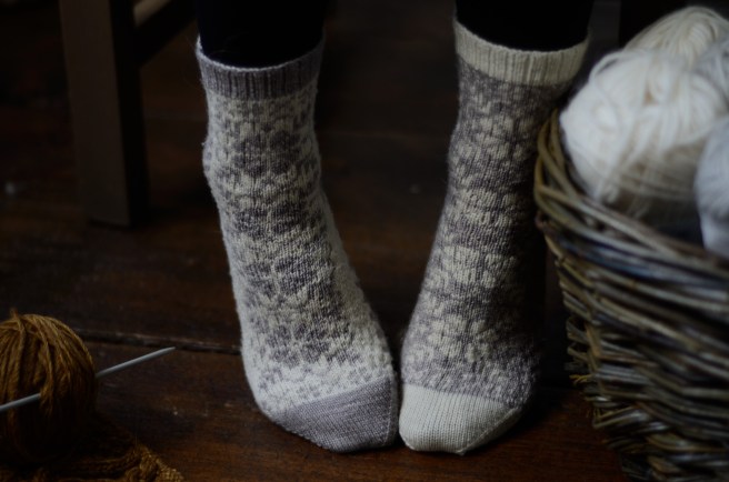 Back to knitting and socks…. I finished the first with the purple heel and cuff in the cabin in Cape Breton, the second was finished just the other day here at our house. I switched the colours because I genuinely thought I didn’t have enough purple to continue and would be interesting to see the reverse colourwork. I was so very wrong about not having enough – I swear I still half of both balls of wool! Fine yarn goes a long, long way apparently!