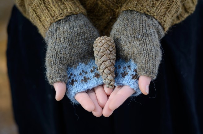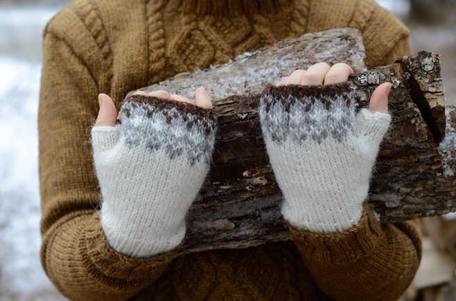A pair of the latest fingerless mitts to go up in the shop! I find these very useful for winter tasks around the house, like collecting firewood from the woodpile and finding birch bark in the forest to easily start fires.